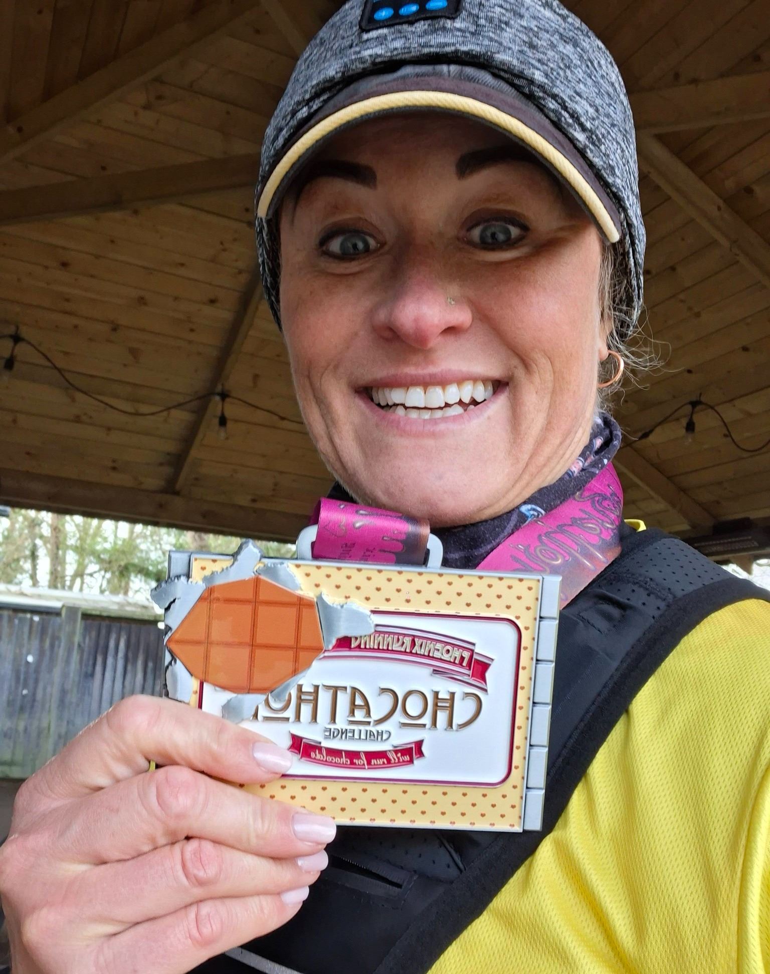 From Lindsay: A lovely weekend for a bimble along the Thames 16 times. So this weekend was the chocothon and cakeathon double marathons (no 25 and 26 for me) and 15 in 15 months. The chairman and I headed to walton on Thames to run with Phoenix Running Ltd who really are a great running family and do fantastic medals at a great price. Look at the designs and size of them lol.