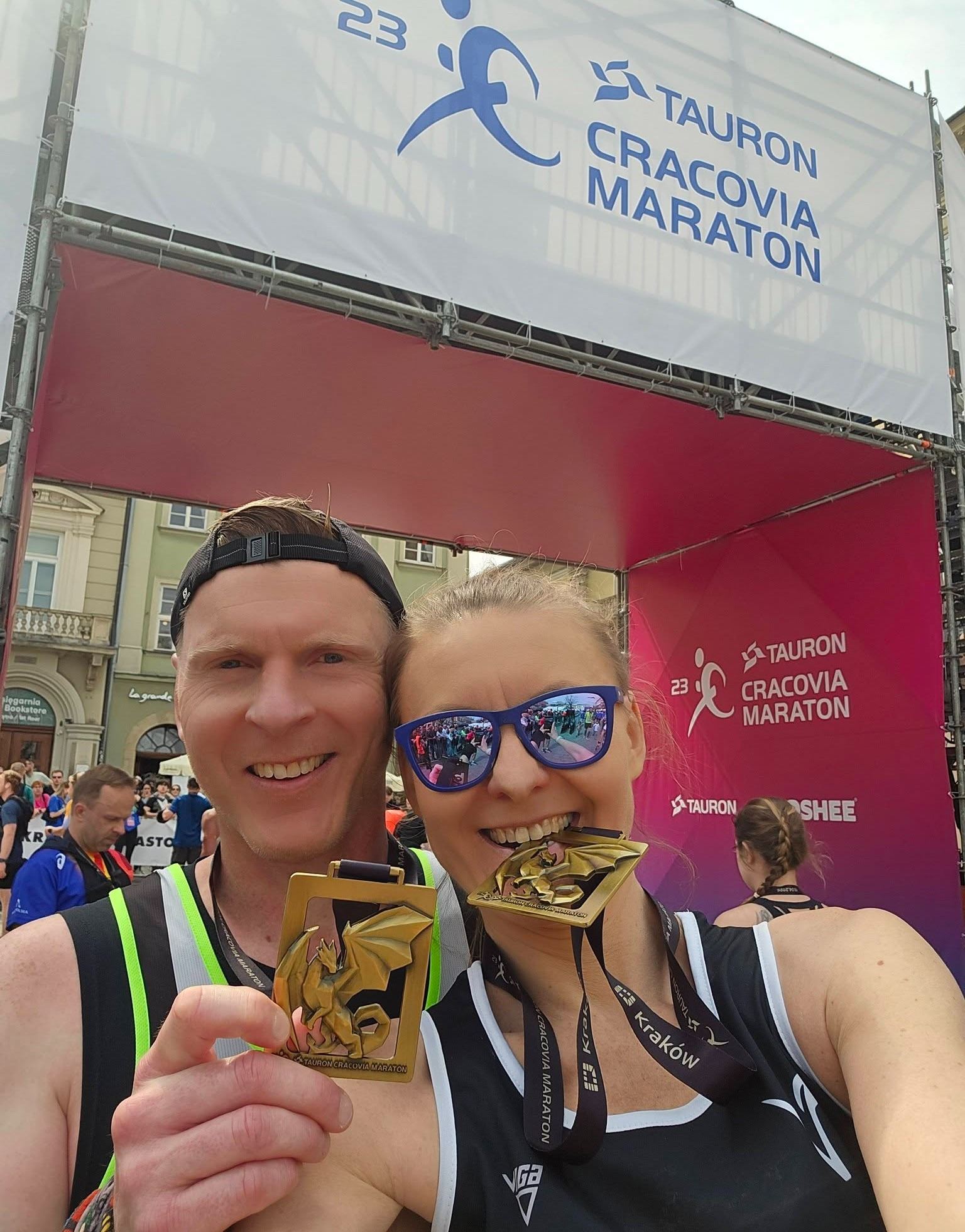 From Mags: Cracovia Marathon this morning, what an event! Thousands of people enjoying the sunshine and 20 degrees temperature, while running around beautiful Kraków. Amazingly organised, fast course, refreshments stations every 3 miles and a cracking atmosphere! We're both really chuffed with our performance, I managed to get 3:44:40 and Leigh was just happy he got around.