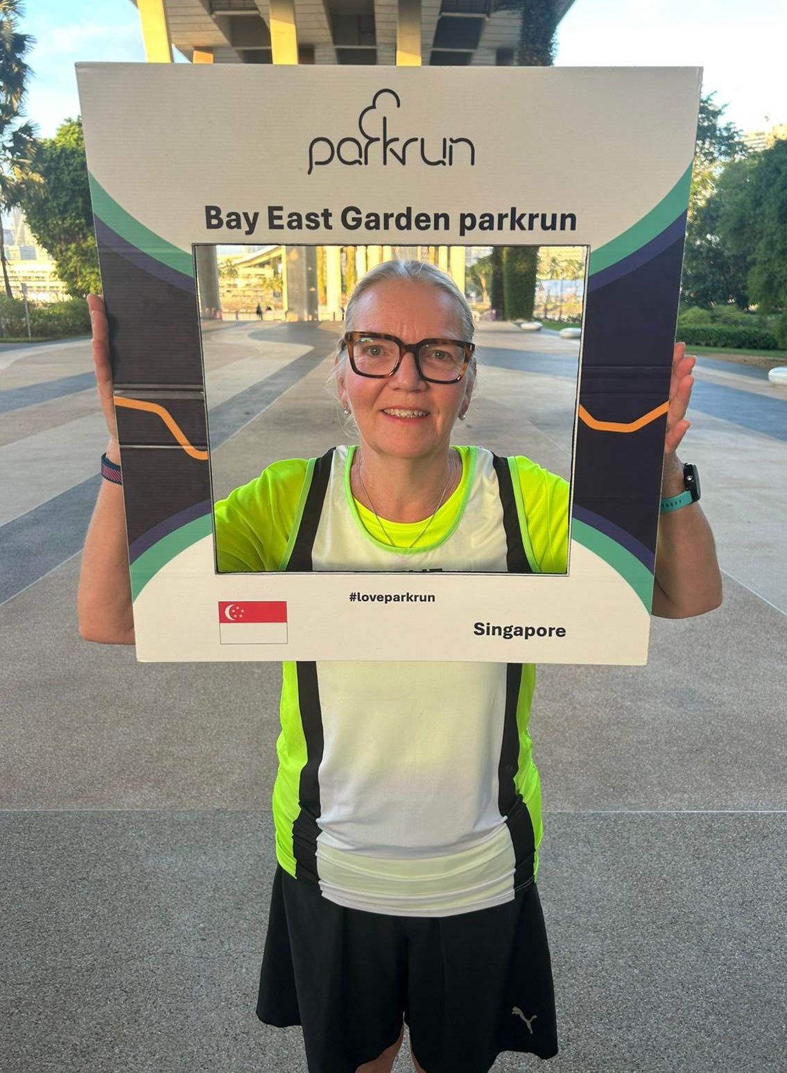 From June: It was an early morning start as we had to catch the MRT at 0615 to get to this park run. Singapore Bay East Garden Park run is a double out and back course and completely flat. Starting just underneath Sheares Bridge the route goes south along the river until the 1.25km turnaround point, then it heads back towards the start at Sheares Bridge, repeating the route for a 2nd lap, finishing under the Sheares Bridge. The view of the Gardens by the Bay as you run along the river stops it from being boring. 30C at 0730 and very humid. I was beginning to feel it towards the end, but happy with 2nd in age category.