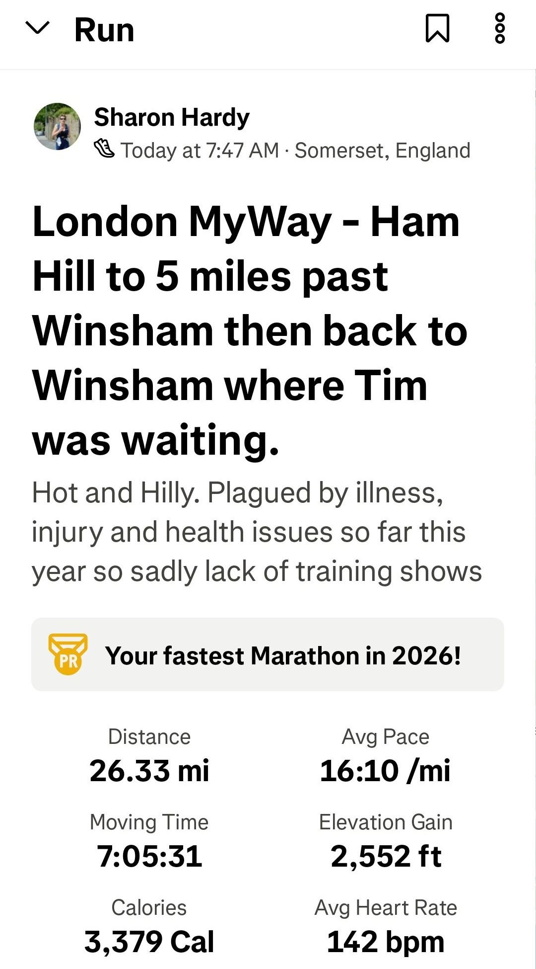 From Linda: Quick early run this morning with Sammy Membury before I make myself bankrupt in the Asics Shop later! Nice mixture of road and countryside.