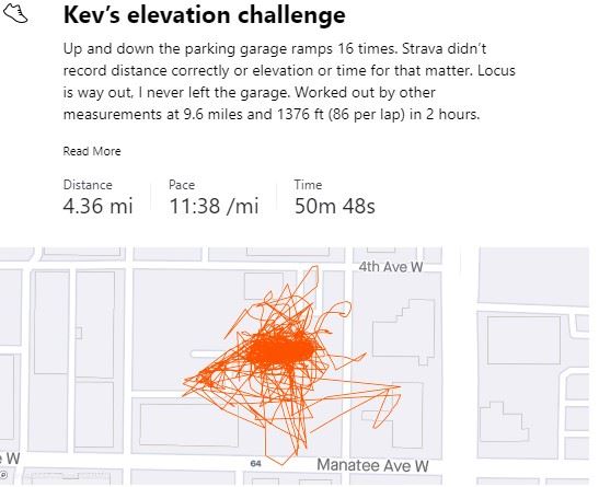Usually do a 2 hour run in the nature preserve on Sat mornings, but succumbed to Kev’s elevation challenge instead today, although I didn’t officially sign up. Nowhere around here much higher than 20 feet above sea level so I drove downtown and did nearly 10 miles without leaving a garage. i.e. 2 hours running up and down the parking garage ramps (multi-storey car park in proper English). Not as onerous as a treadmill but close. Unsure whether Strava would work in a closed space, so I checked a few days before with the County Public Works on the height and biked up it to get the distance. Sure enough Strava was a mess, even the locus went to places that I didn’t. 34 degrees and 91% humidity but at least in the shade except the top two ramps; thought I would do a lot better but after 2 hours my legs fell off. End result after 16 climbs was 9.6 miles and 1376 feet. Thanks Kev for the motivation and opportunity to feel part of the club again. It’s also reminded me to include a session a week like this into my training plans for when I get over there for a spell, whenever that may be. Hope you’re all keeping clear of the plague.